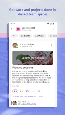 Tabbatar da ayyukanka da tsare-tsarenka tare bai taɓa zama mai sauƙi ba. Tare da Microsoft Teams Free, zaku iya raba hotuna da bidiyo cikin sauri don isar da muhimman lokuta. Yi amfani da sararin ajiya na gajimare don samun damar shiga takardu da fayiloli da aka raba ko'ina. Shirya abubuwan da aka raba a cikin al'umma—kamar abubuwan da suka faru, hotuna, hanyoyin haɗi, da fayiloli—don kar ka ɓata lokaci kana nema. Inganta tarurrukanku ta hanyar amfani da raba allo, allon farin allo, ko rabuwar ɗakuna a cikin tarurruka na zahiri. Kuma don kula da ayyuka da tsare-tsare, yi amfani da jerin ayyuka don sanya ayyuka, saita ranakun cikawa, da kuma cire abubuwa don tabbatar da cewa kowa yana kan hanya ɗaya.